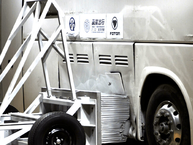 In 2021, FOTON completed the world’s first collision test of a 70 MPa hydrogen fuel bus which filled the gap in China’s hydrogen fuel bus collision safety research. The product is FOTON’s latest generation of fuel cell bus products specially developed for the 2022 Beijing Winter Olympics. The model is equipped with 8 units of 70 MPa hydrogen storage cylinders installed in the lower luggage compartment position of the vehicle. The collision test was carried out by a moving barrier weighing 1.4 tons hitting the weakest side of the hydrogen cylinder compartment at a speed of 53 km/h. This test standard is already higher than the national standard for testing the collision safety of lithium-ion power battery buses.